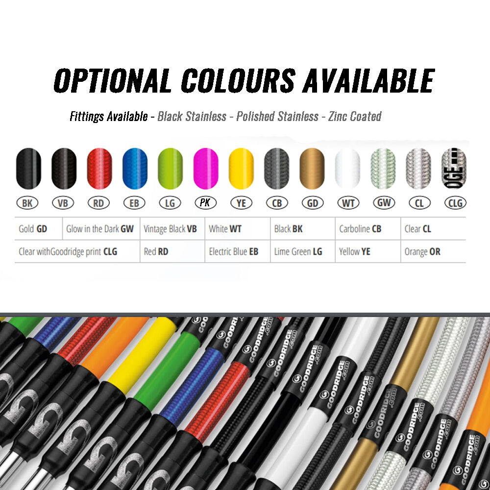 Goodridge stainless steel motorcycle brake and clutch line kits feature the finest quality hose, consisting of a PTFE inner and stainless steel braided outer coated in a plastic protective coating in the colour of your choice.