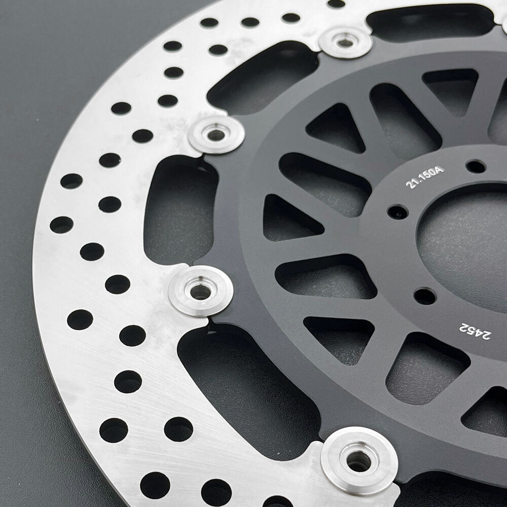 21-150-A-BK (black) and 21-150-A-GL (Gold) is made from AISI410 stainless steel from Japan and mounted to a precision cut CNC carrier in alloy. This disc is found on the Honda SC30 CB 1000 F that takes 45120-MZ1-003 and 45220-MZ1-003.