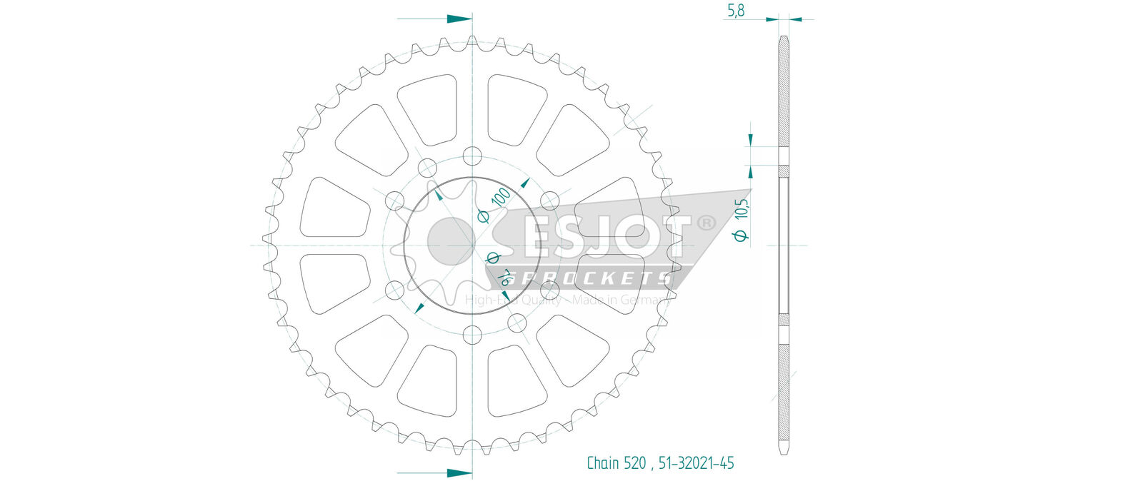 ESJOT aluminium sprockets have been developed especially for the tough conditions in Motocross, Enduro and road use. Compared to conventional steel sprockets, an ESJOT aluminium sprocket brings a weight saving of over 60%. The use of high-quality aluminium (7075 T6), as well as the extremely low manufacturing tolerances ensure an extraordinarily long service life.