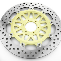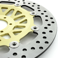 21-150-A-BK (black) and 21-150-A-GL (Gold) is made from AISI410 stainless steel from Japan and mounted to a precision cut CNC carrier in alloy. This disc is found on the Honda SC30 CB 1000 F that takes 45120-MZ1-003 and 45220-MZ1-003.